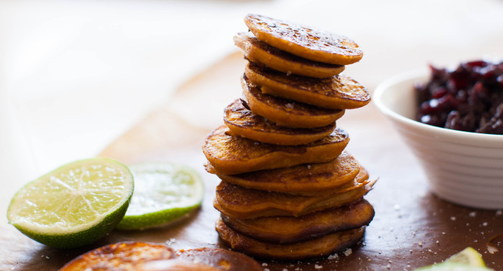 Ingredients 1 cup balsamic vinegar 1 1/2 cups coconut sugar 1 clove 1 teaspoon peppercorns 1 stick cinnamon 2 bay leaves 2 whole beetroots, peeled & grated 1/4 jap pumpkin, cut into small pieces 1/2 cup coconut flour 1/2 cup tapioca flour 2 teaspoons paprika 2 eggs 1 teaspoon salt Directions Pre-heat oven to 180°C. Place balsamic vinegar, coconut sugar, clove, peppercorns, cinnamon stick and bay leaves in pot. Bring to boil, allow sugar to melt and let simmer for about 15 minutes. Remove spices from stock and add beetroot. Leave on low heat and cook until reduced to a relish consistency. Bake pumpkin for approximately 25 minutes or until soft. Place pumpkin, coconut and tapioca flours, paprika, eggs and salt in food processor and blend until smooth. In pan on medium heat , place spoonfuls of pumpkin mixture to make small pancake-shaped fritters. Leave for 2-3 minutes before flipping. Increase/decrease heat of frypan as needed. Serve fritters with beetroot relish.
