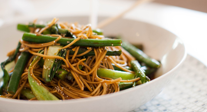 Ingredients 1 tablespoon sesame oil 1 bunch broccolini, chopped 1 bunch pak choy, chopped 100g green beans 1 pkt soba noodles 4 nori sheets 1/2 cup tamari 1/4 cup honey 2 tablespoon sesame oil 1 tablespoon minced ginger 2 tablespoons sesame seeds Directions Lighty saute vegetables in sesame oil for only a few minutes so vegetables are still crunchy. Cook soba noodles according to instructions on package. Once ready, place in ice water until cool. Drain off excess water and add to lightly sauteed vegetables. In small bowl, combine the tamari, honey, sesame seeds for dressing. Stir until combined. Cover noodle salad with dressing and stir until completely covered. Serve
