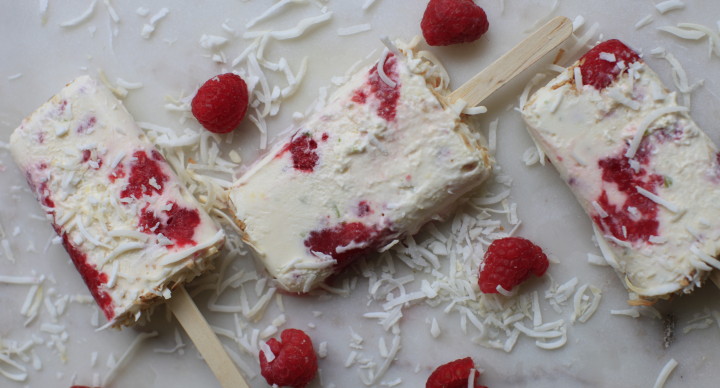 Ingredients 1/4 cup heavy cream 2 cups natural yoghurt Juice and zest from 3 limes 1 cup raspberries 1/2 cup toasted & shredded coconut Maple or other sweetener to taste Directions Beat the cream with an electric beater until stiff peaks form. Gently mix in yoghurt with a silicon spatula. Once combined, add the juice and zest from the limes, coconut and raspberries. Taste it now and if you prefer it a little sweeter, add some sweetener of our choice. Pour evenly into ice cream moulds and stick a paddle pop stick in the end. Set in the freezer (best to leave overnight).