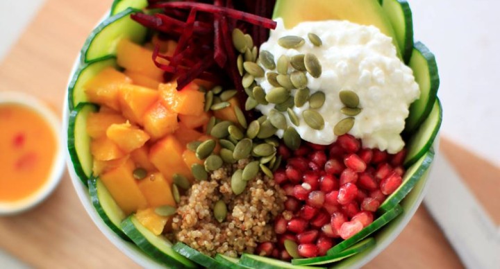 Ingredients 50g baby spinach 50g kale 1/2 cup cooked quinoa 1/2 pomegranate, seeded 1/2 ripe mango, cubed 1/2 avocado, cubed 1 whole cucumber, sliced finely 1/2 fresh beetroot, sliced finely 1/2 cup cottage cheese 1 tbsp pepitas or sunflower seeds or a mix of both Dressing 1/2 whole long chilli finely sliced 2 tbsp raw honey 1 whole lime, juice and zest 1/8 cup flaxseed oil Directions One the stove, slightly heat the honey, lime juice and chilli until honey has melted and it has combined with the lime juice. (You can keep the chilli seeds in or out, depending on taste). – should take 1-2 minutes. Once combined, set aside to cool. Cook quinoa as per the instructions on the packet. Place kale, spinach and quinoa in the bottom of a bowl. Once you have chopped, sliced and diced all other components, place on top of the salad in the bowl. Add the flaxseed oil to the dressing. Pour dressing over the top.