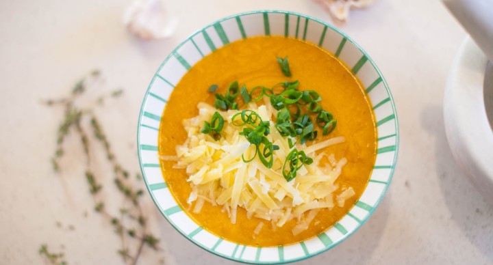 Ingredients 3 cloves garlic, whole 1 medium onion, diced 2 tbsp olive oil 4 cups chicken broth 2 medium sweet potatoes, peeled and diced 1 large apple, peeled, cored and diced 1 medium carrot, diced 1/2 tsp thyme Salt and pepper to taste 1/4 cup cream Shaved pecorino and chopped parsley to serve Directions In a large pot, sauté the garlic and onion in the olive oil. Add the chicken broth and carrot and bring to the boil. Once boiling, add the diced sweet potato and apple and thyme. Let simmer until sweet potato and apple are soft. Transfer to a blender, add salt, pepper and cream and blend until smooth. To serve, sprinkle shaved pecorino and parsley on top.