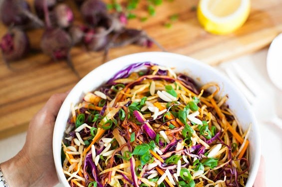 Ingredients 1/2 purple cabbage, finely sliced 1/2 green cabbage, finely sliced 1 medium carrot, julienne or grated 3/4 cup slivered almonds 1/2 bunch shallots, finely chopped Dressing 1 clove crushed garlic 1/2 tsp ground paprika 1/4 tsp ground chilli 1/2 tsp ground cumin 1/2 tsp salt 3 tbsp lime juice 1/4 cup olive oil Directions In a medium bowl, combine cabbage, carrot, almonds and shallots. Add all other ingredients in a small bowl. Stir until all combined. Drizzle the dressing all over the slaw and mix through, coating the whole salad lightly. Season to taste.
